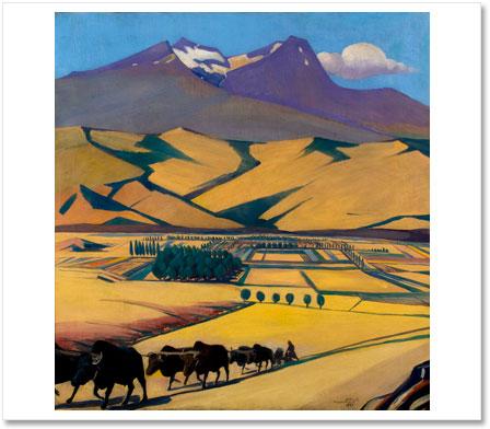 The viewer can see a multi-aspect panorama with the violet mountain tops of monumental Mt. Aragats towering above the horizon. From the picture’s depth we see a ploughman with a plowshare in his hand and yoked oxen walking towards the viewer. With its basalt heaviness Aragats highlights hard and at the same time so vitally important and sacred labor of a plowman. The following words of Sarian are the key to the picture’s main idea: ‘ My aim is to reflect the tangible existence of our little country that has witnessed plenty of disasters and was repeatedly defiled but sanctified with blood and belief. This rocky piece of land on the slope of Aragats is a source of hope for me.
